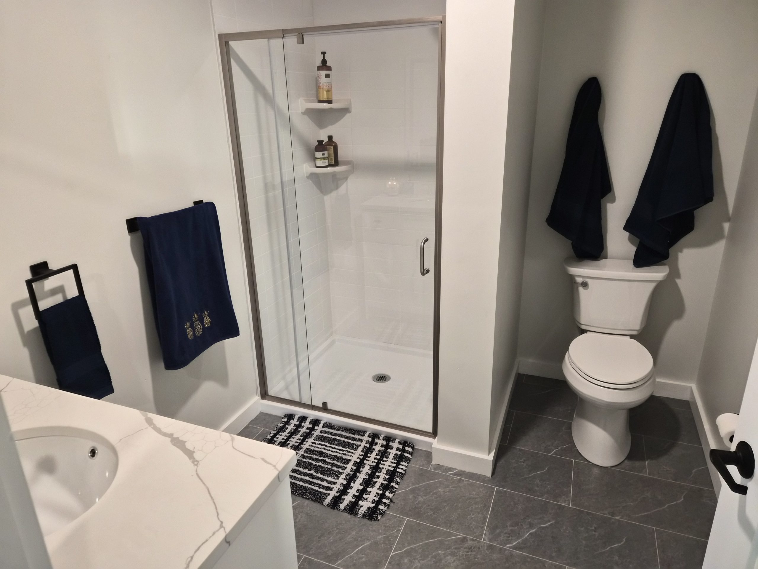 tiled showers, stainless steel appliances, dishwashers, LED